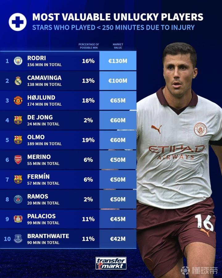 近年来,足球界因球员伤病而引起的关注不断增加。转会市场网对本赛季因伤出场时间少于250分钟的球员进行了统计,让我们看到了一些出人意料的结果。在这份排行榜上,罗德里以仅仅156分钟的出场时间,身价高达1.3亿欧元,成为了因伤提前告别本赛季的一员。而排在第二位的卡马文加,仅出场138分钟,却身价达到1亿欧元,也引人注目。